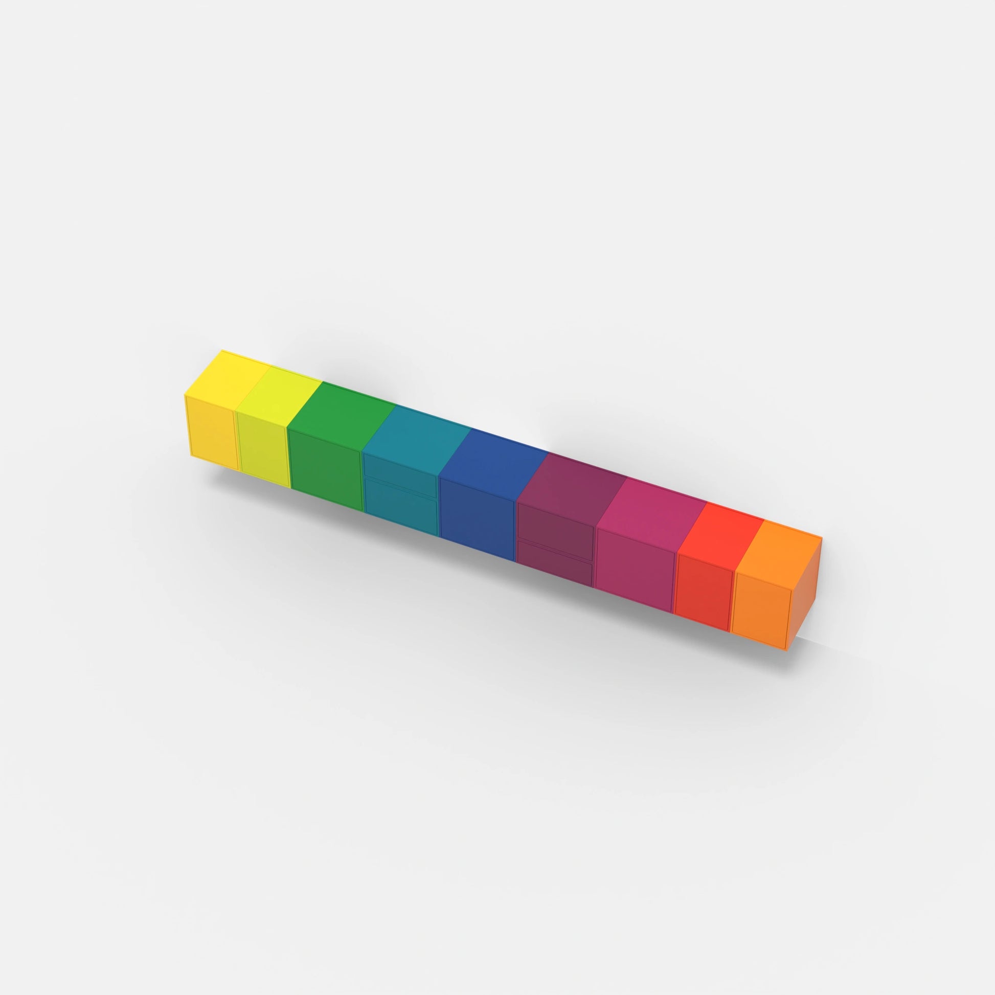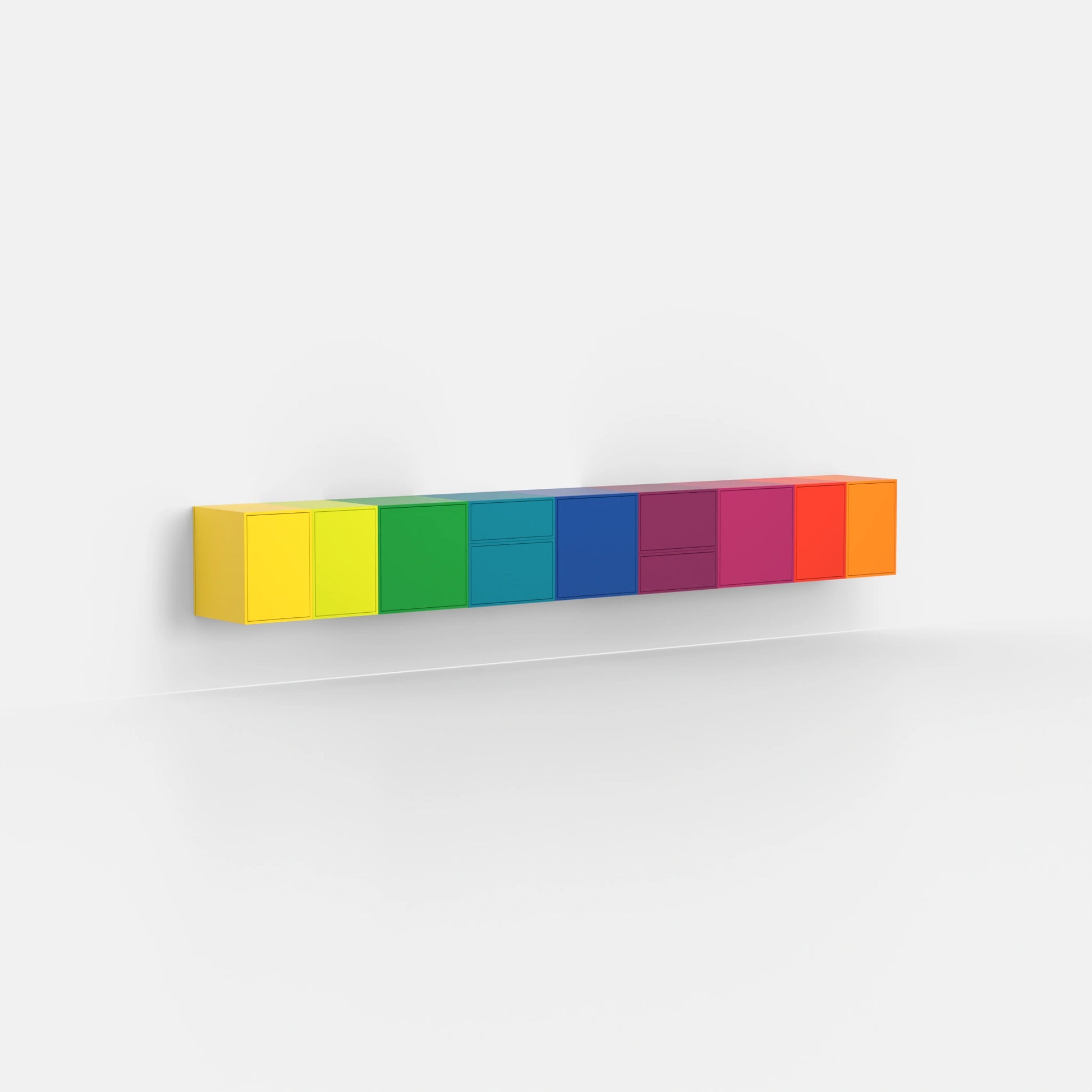 Cubit Regale in allen Farben des Regenbogens als Wandinstallation, geordnet in einem fließenden Farbverlauf – Ausdruck maximaler Farbvielfalt und Gestaltungsfreiheit