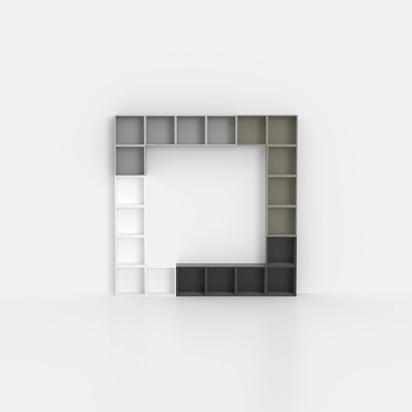 Die Regalmodule orientieren sich an den gängigen Literatur- und Musikformaten, z.B. Din A4, A5, Aktenordnern, Atlanten, Bildbänden & Schallplatten. Dieses vom Inhalt kommende Größen-Raster ermöglicht einen einzigartigen skulpturalen Look.